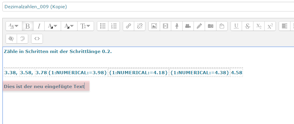In erster Linie folgendes Muster: Wenn ich in ein bereits formatiertes Textfeld einen Text einfügen will, so wird das ganze Textfeld auf die Standardformatierung zurückgesetzt. Dies ist vor allem mühsam, wenn beispielsweise duplizierte Testfragen bearbeitet und längere Textstellen eingefügt werden sollten.
