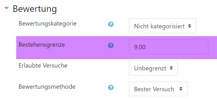 - Erreichen der Bewertungsgrenze notwendig: Für Übungen (Tests), welche Schülerinnen und Schüler auch mehrmals lösen können, z.B. bei zufallsgenerierten Aufgaben, und bei denen ich erwarte, dass sie z.B. 80% richtige Antworten geben (> Stichwort: Mastery).