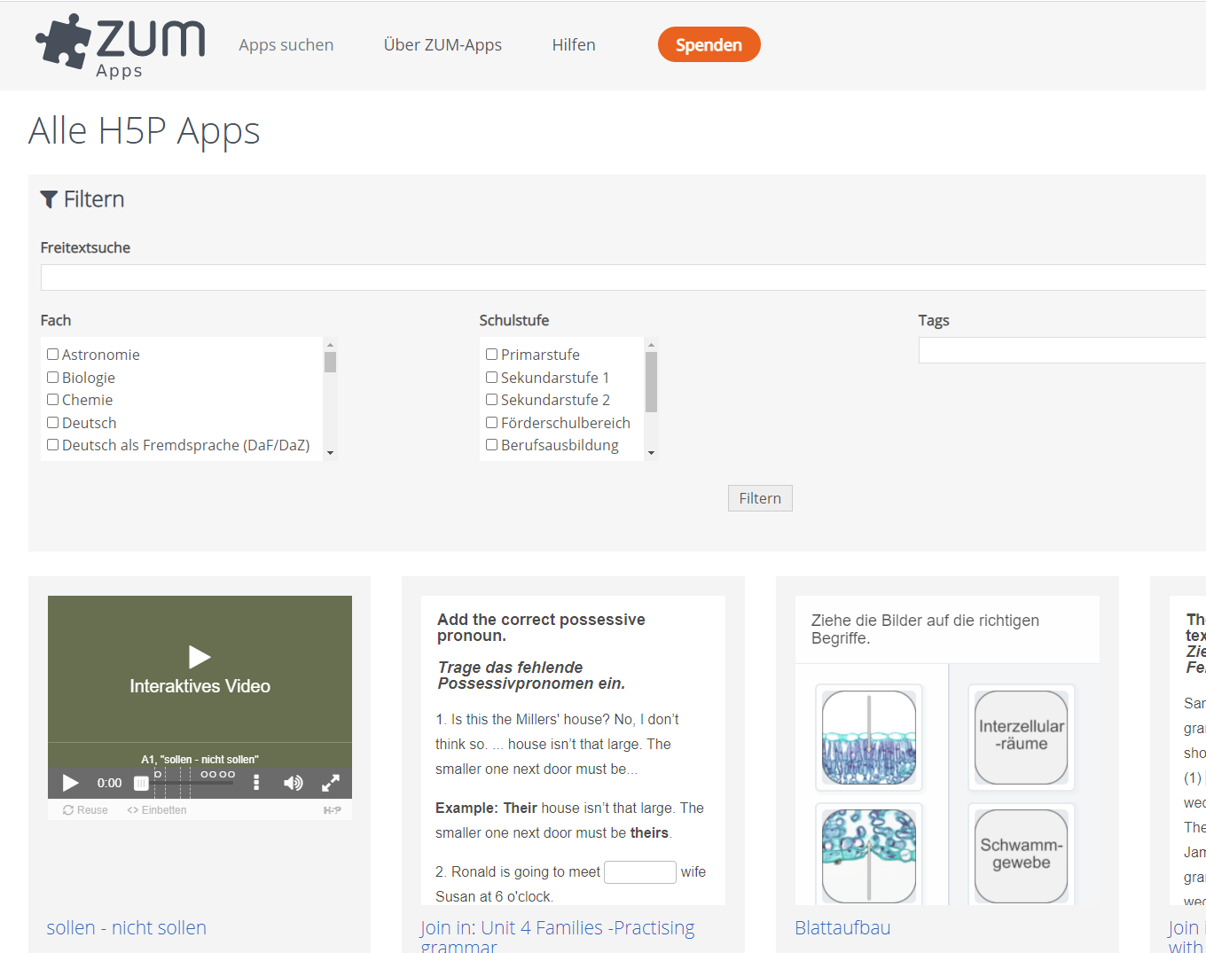 Ich möchte gerne auf unserer Moodleseite eine Datenbank anlegen, wo LP einfach ihre h5p-Aufgaben ablegen können. Die Einträge sollen danach übersichtlich dargestellt werden. Im Idealfall kann die LP mit Suchanfragen und Filter die Auswahl der angezeigten Inhalte beeinflussen. Auf https://apps.zum.de/apps gibt es ein gutes Beispiel, wie ich mir das vorstelle